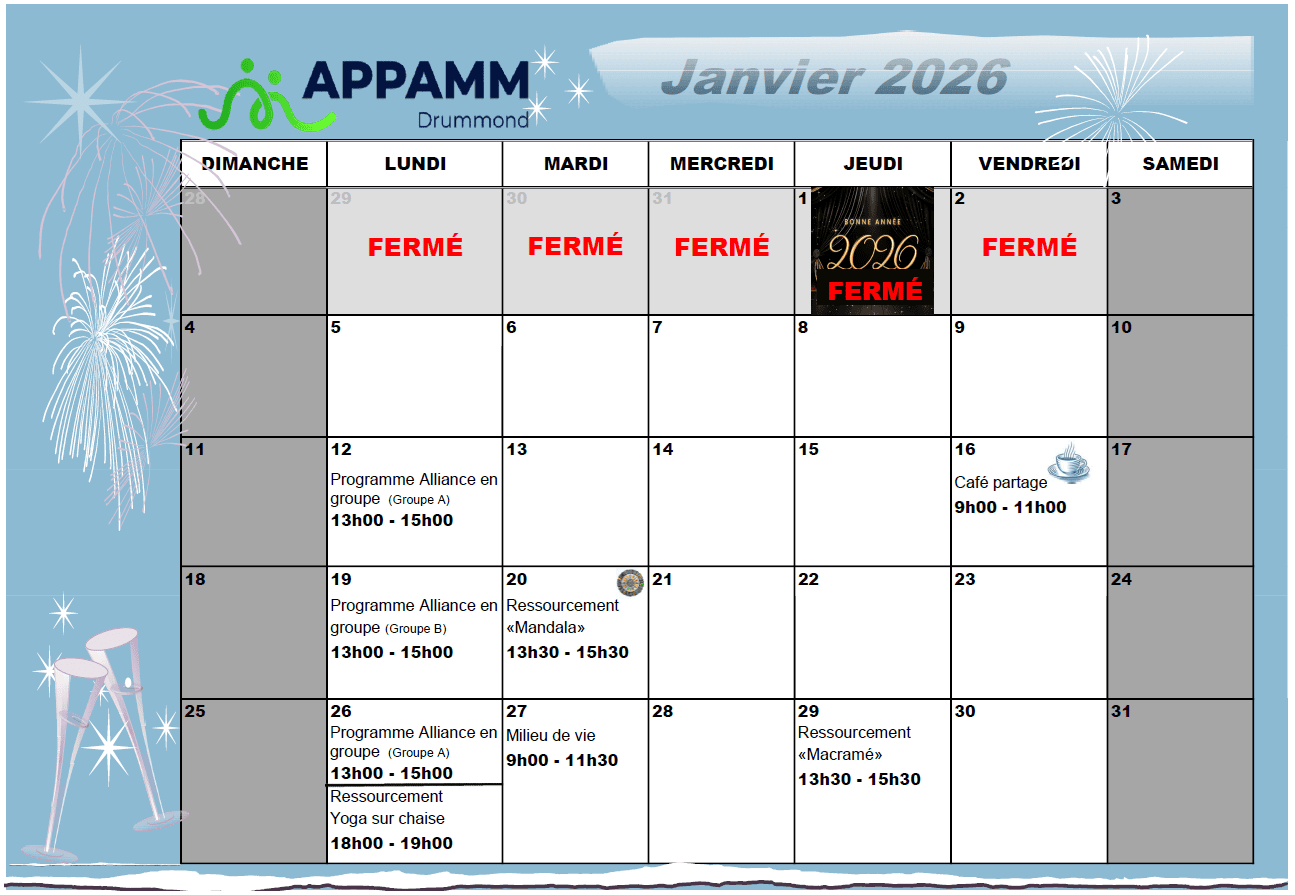 Calendrier de l'APPAMM-Drummond: Janvier 2026