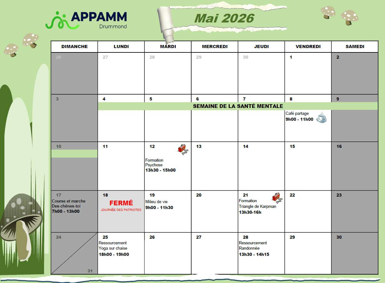 Calendrier de l'APPAMM-Drummond: Mai 2026